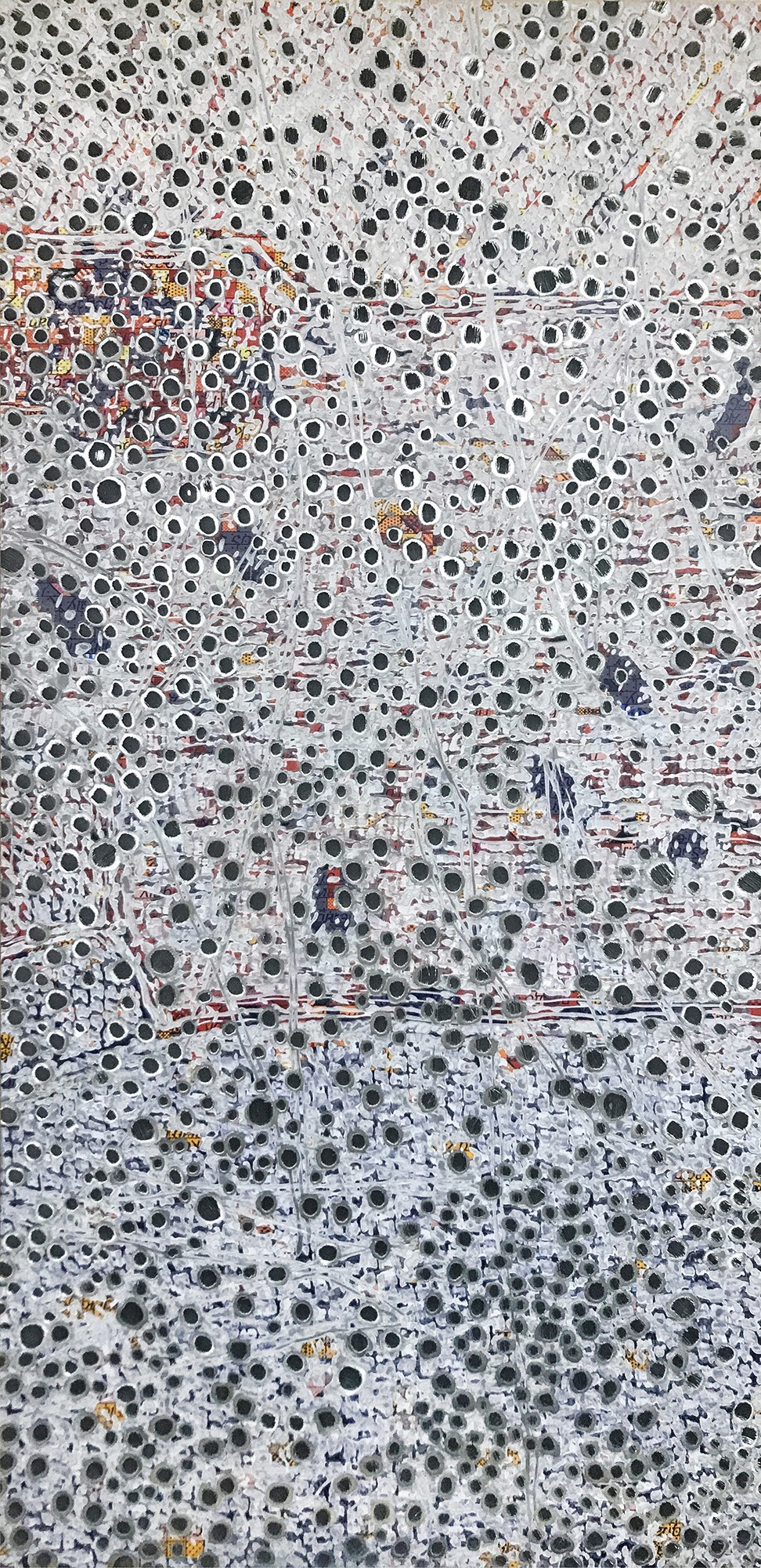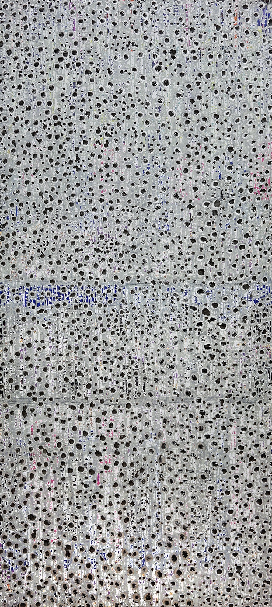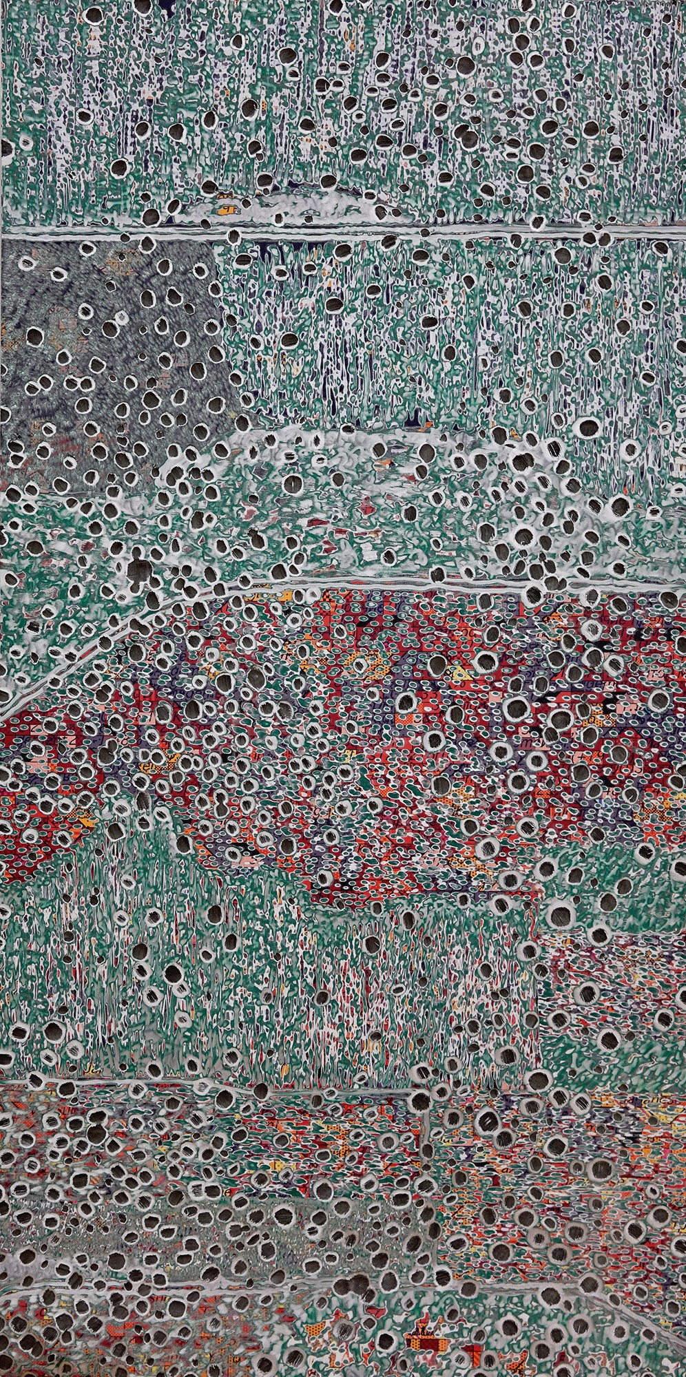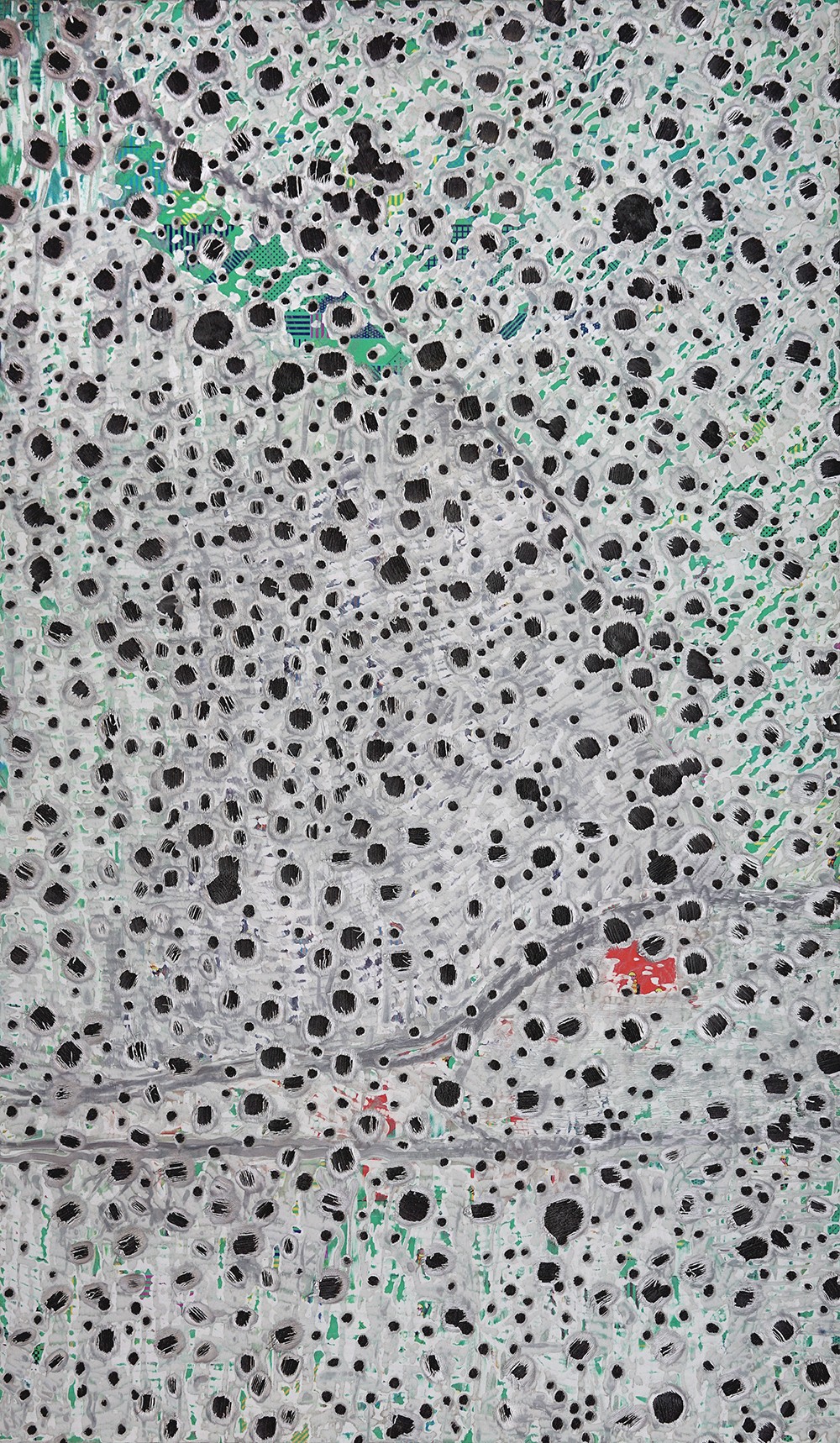 2000holes, from the “Bombed” series, 2020. Mixed media, 257 x 143 cm