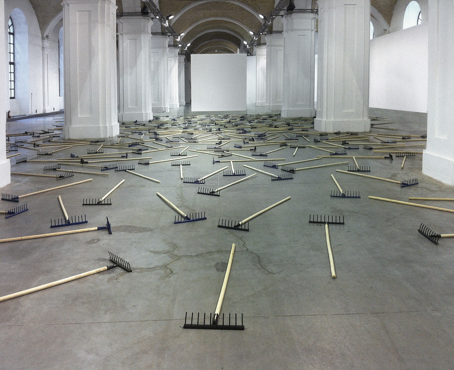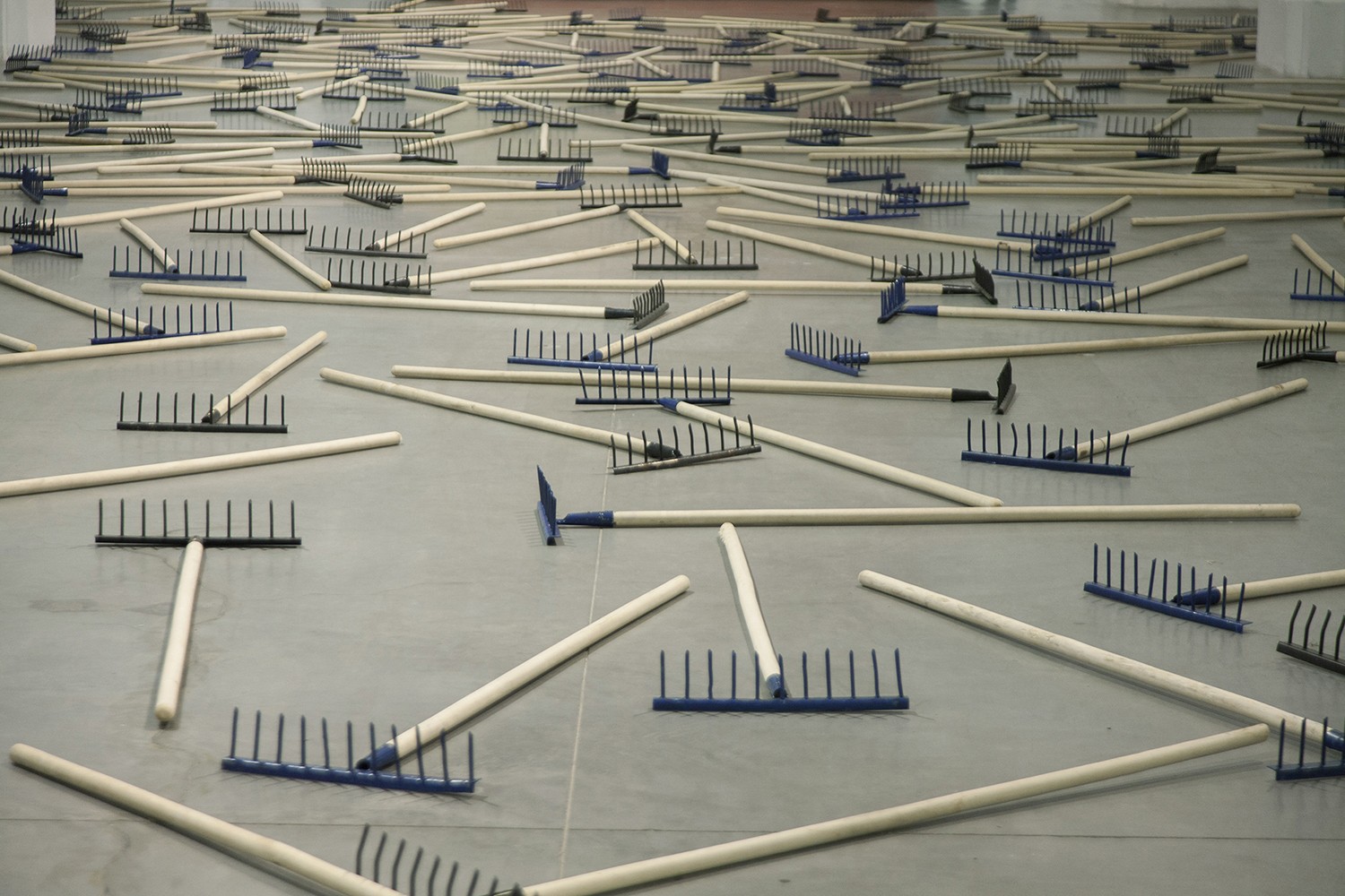Installation of 500 rakes, which compulsively makes one thinking about each step.