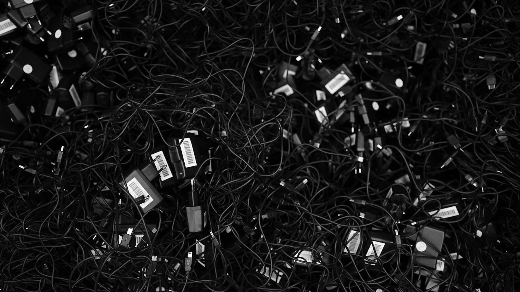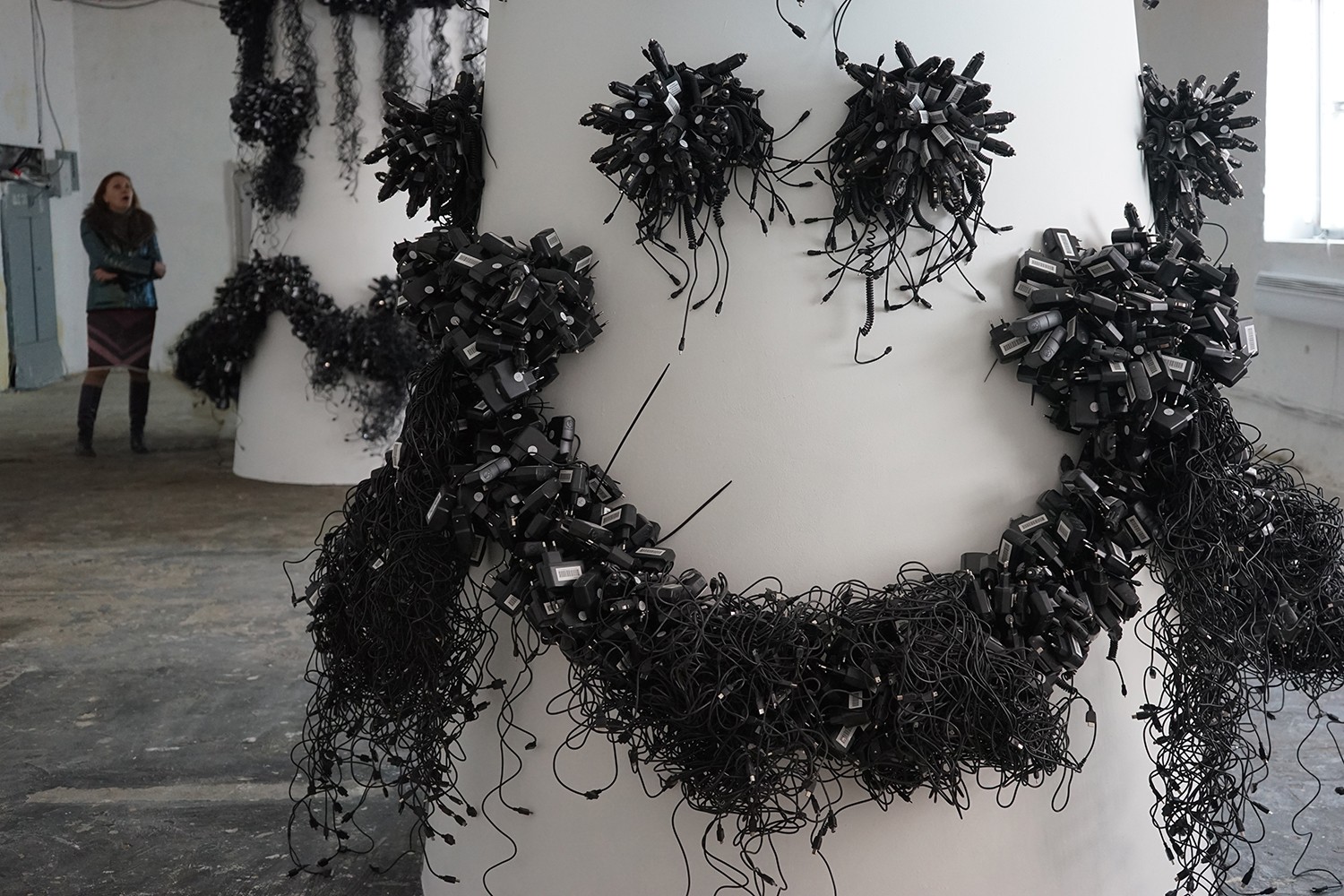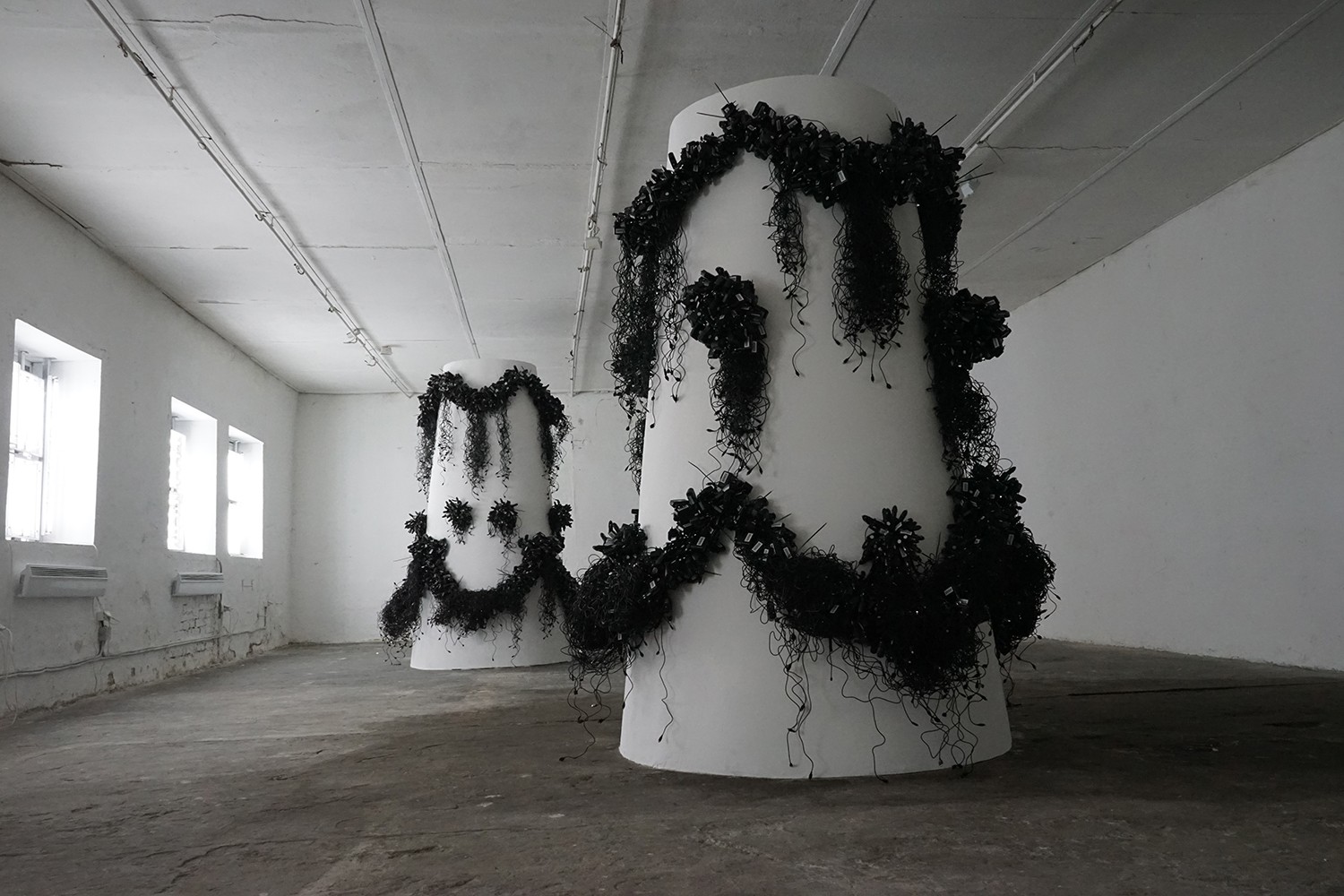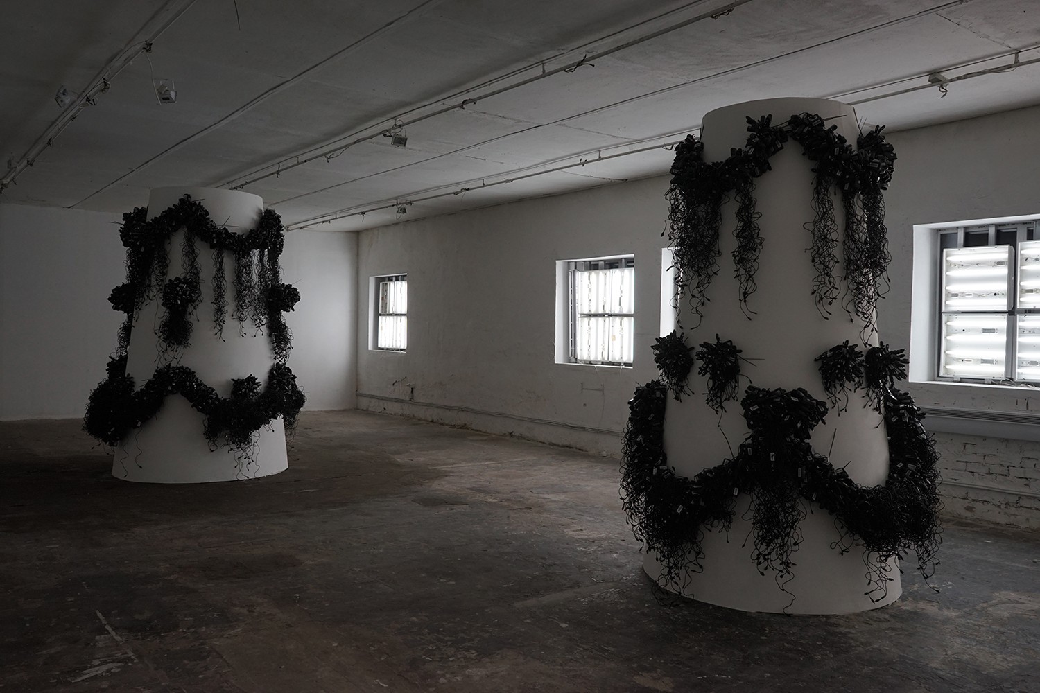 5 windows with raster lams instead of sunlight and two columns decorated with roman style festivegarlands, made of 10 000mobile phone chargers. Triumph of plenty.