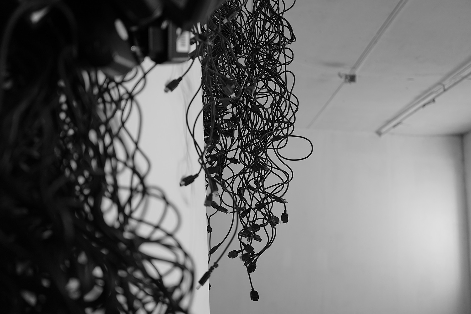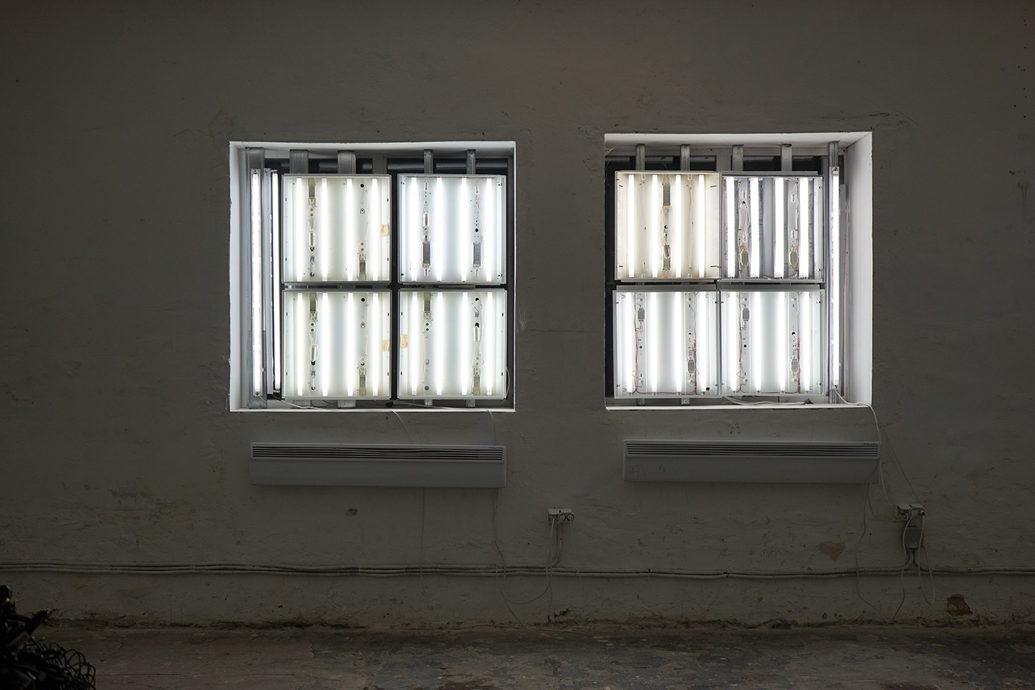 Empire of plenty, 2016, installation. Columns, mobile chargers, Raster lamps, metal profile, dimensions variable