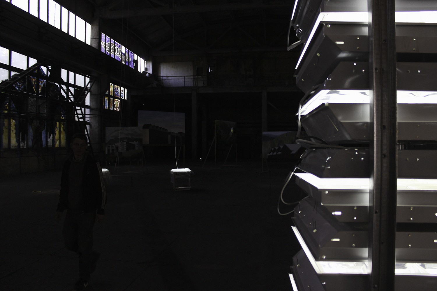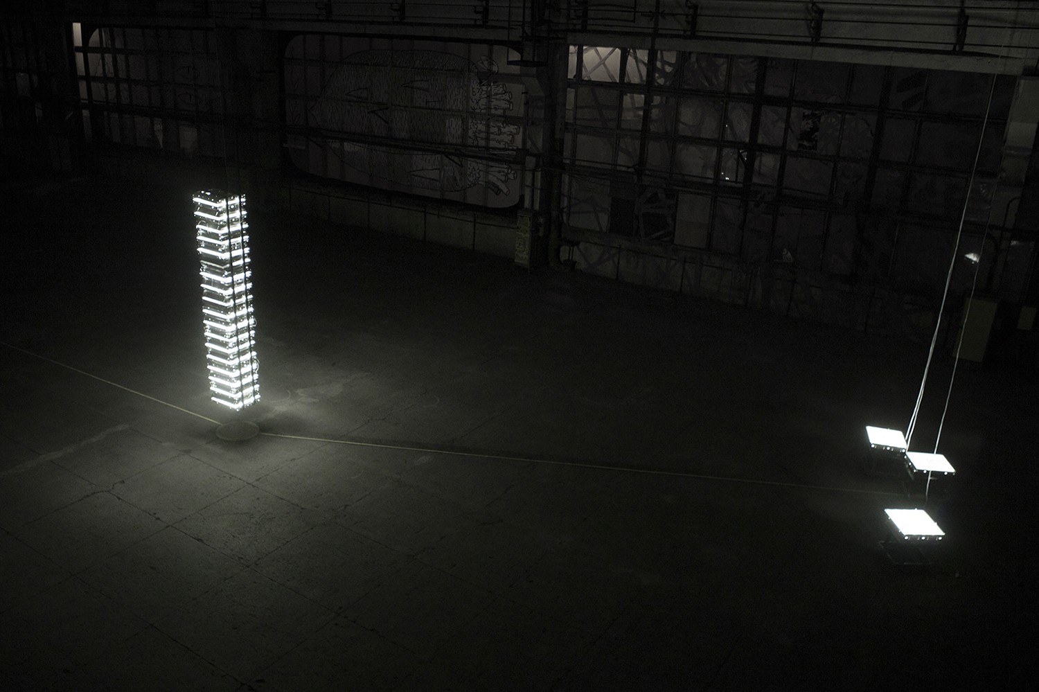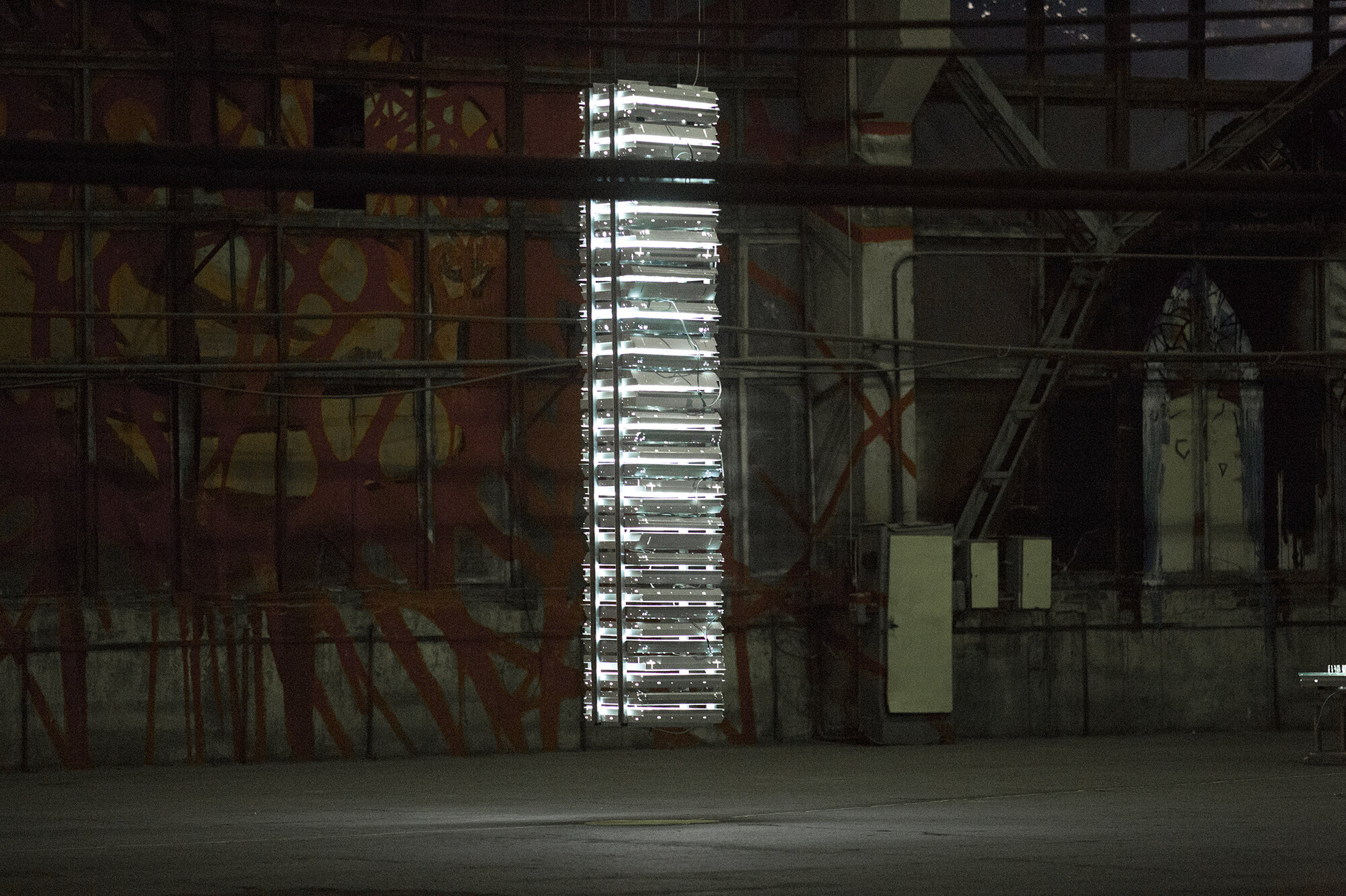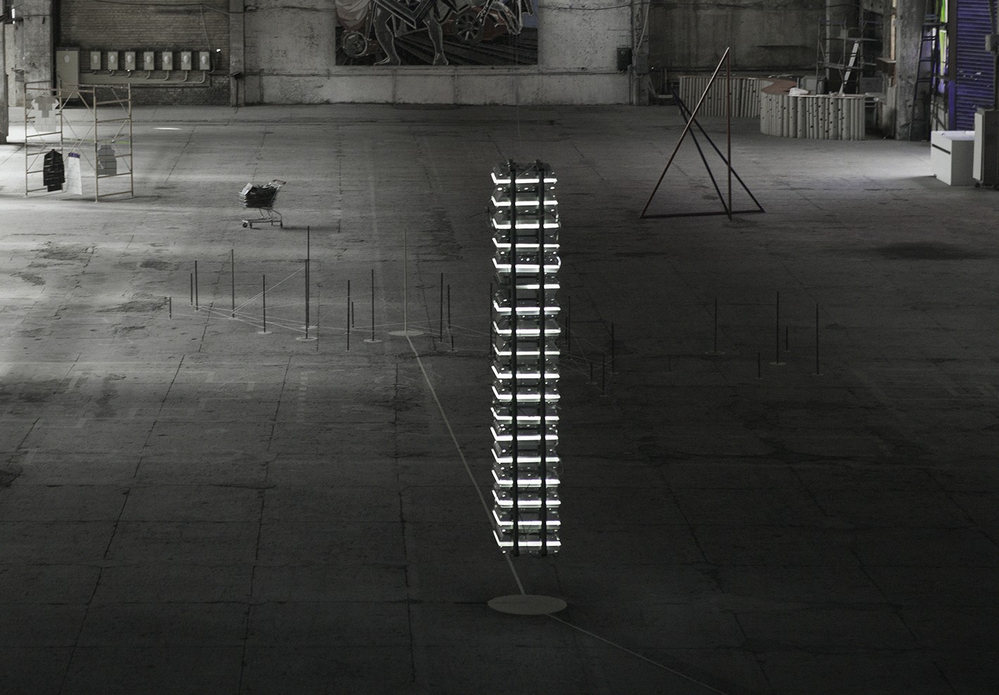 Object that enlightens itself. 2014, installation. Raster lamps, wires, metal profile, dimensions variable
